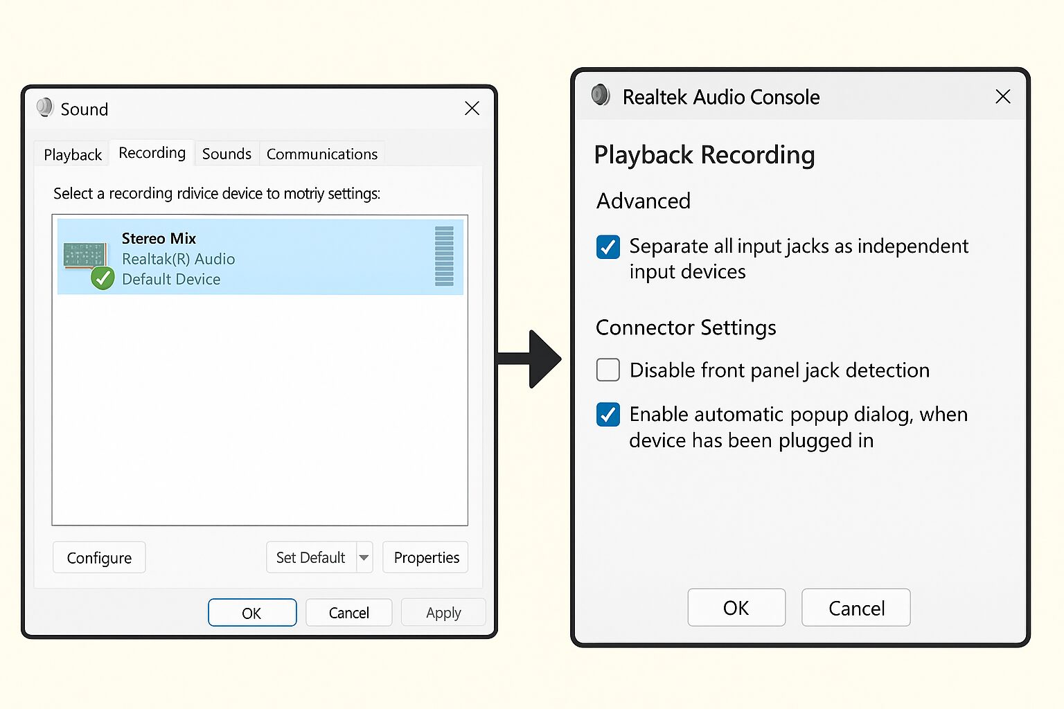 Realtek搭載のPCでは、音声ジャックの設定が原因となることがあります。