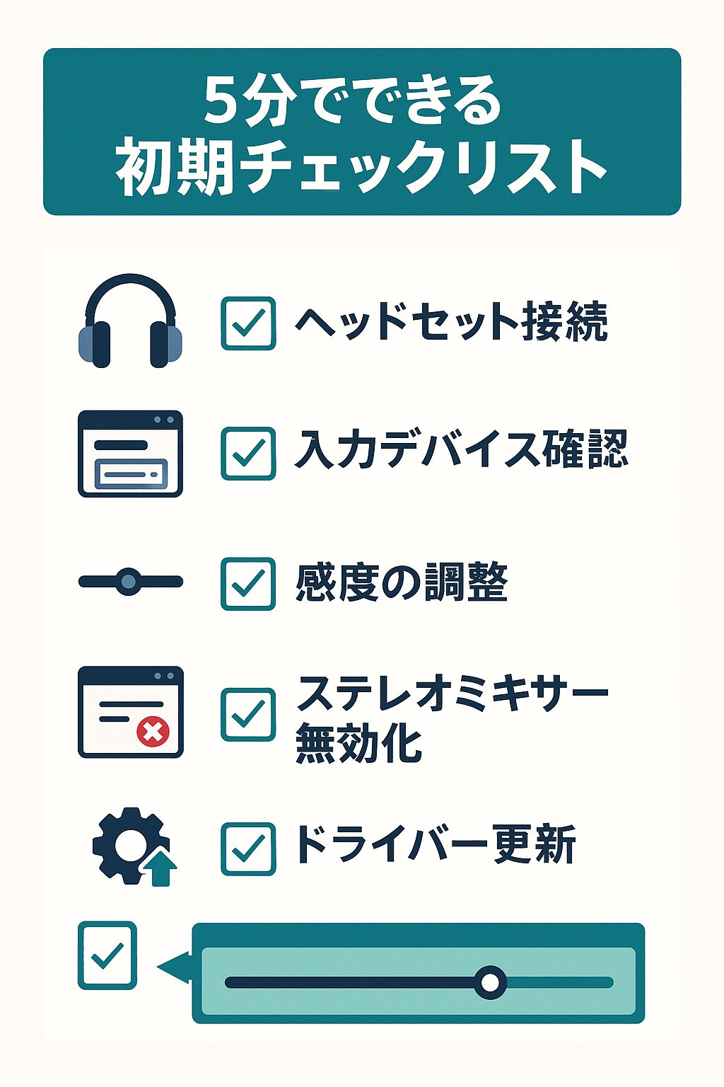 特に入力デバイスや感度調整、ノイズ抑制の有効化などは、見落とされやすいポイントです。