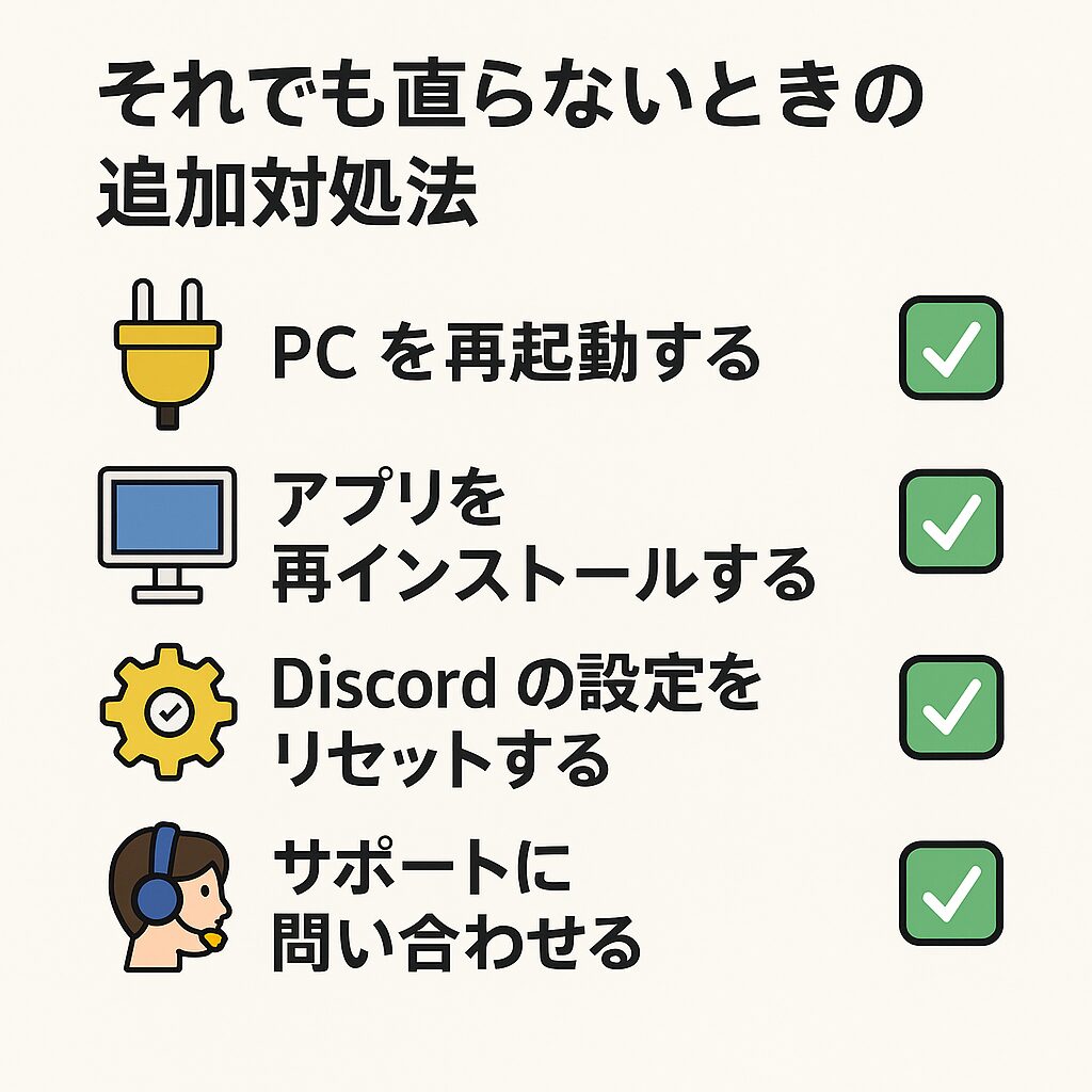 - Discordアプリ側の音声設定(入力デバイス・感度・ノイズ抑制)を見直すと改善しやすい