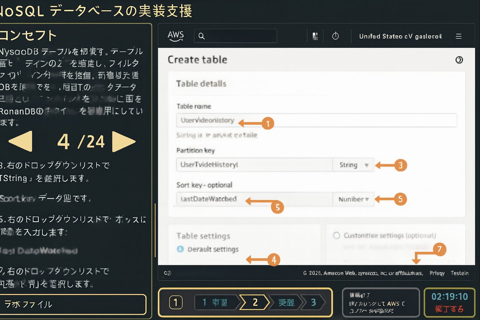 操作内容の説明(下の画像の左部分)、画面キャプチャと操作順(下の画像の右部分)を見ながらAWSマネジメントコンソール画面を操作していきましょう。