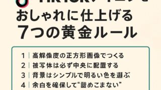 TikTok 初心者でも失敗しない。TikTokアイコンをおしゃれに仕上げる7つの黄金ルール TikTokアイコンをおしゃれに整える7つの黄金ルールを初心者向けに解説。背景・サイズ・構図のコツから自然光での撮り方まで、失敗しない作り方をやさしくまとめました。今日から印象が変わる実践ガイドです。 2025.12.29 TikTok